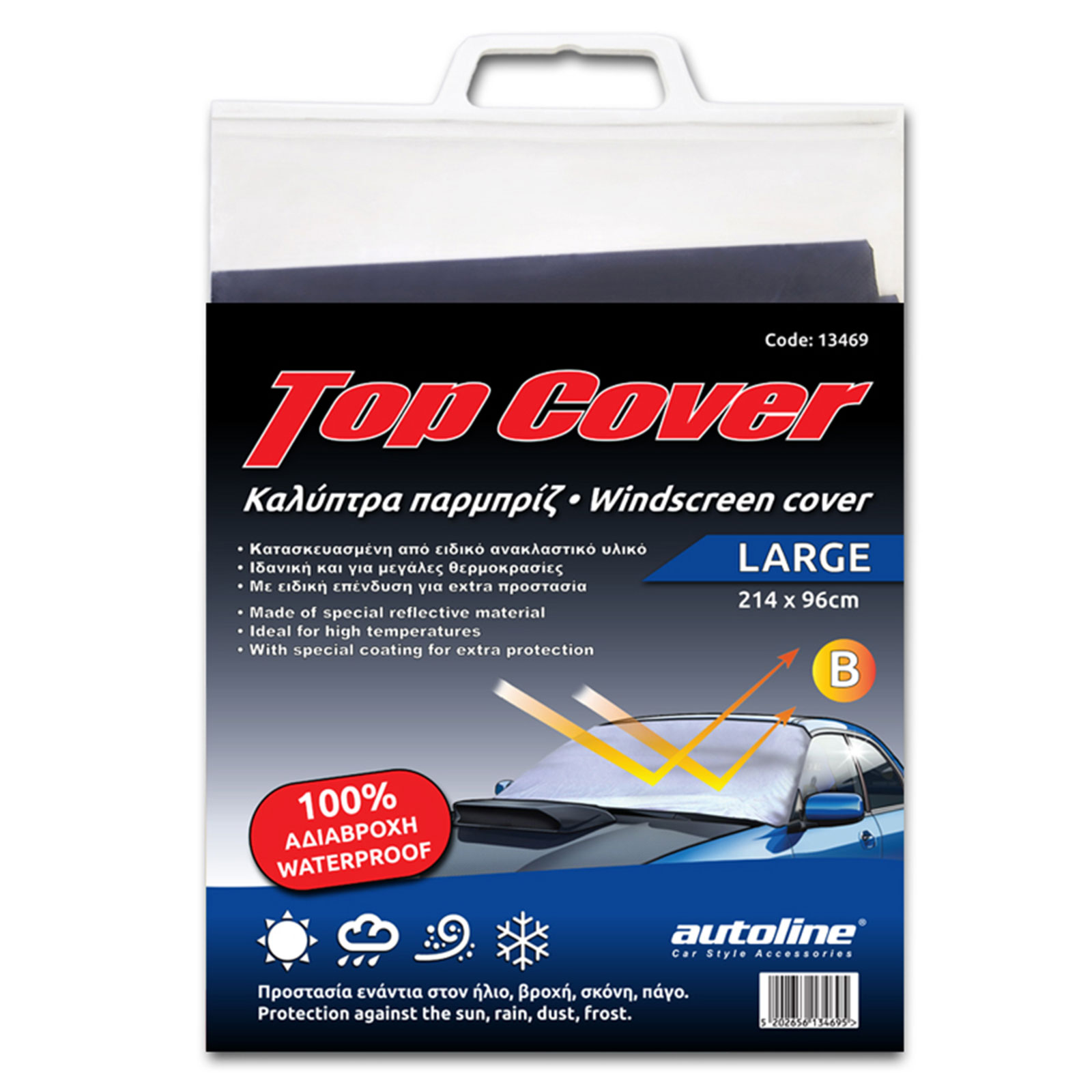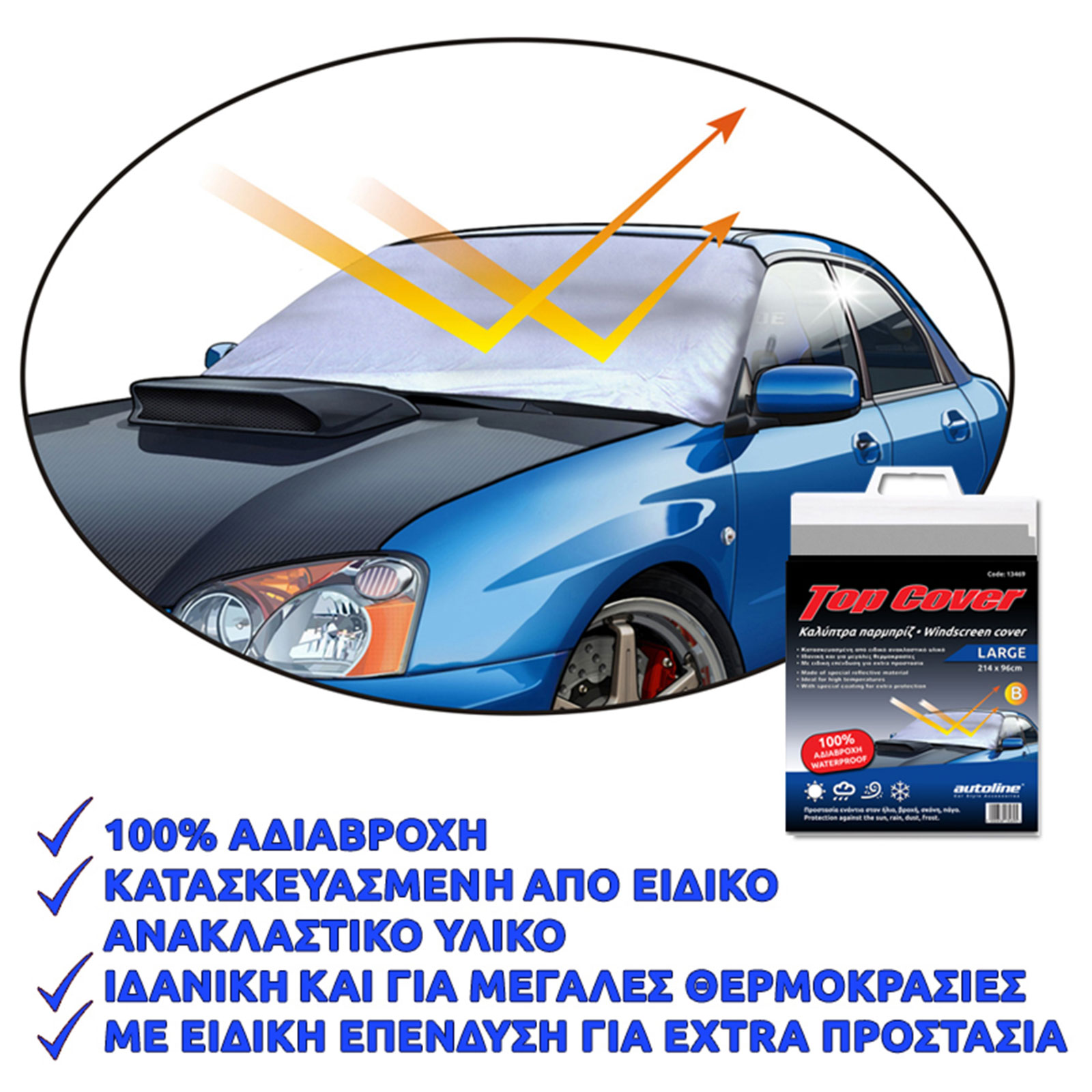 To Κάλυπτρο παρμπρίζ αυτοκινήτου της Autoline Topcover προσαρμόζεται εύκολα στο παρμπρίζ χωρίς να αφήνει κενές επιφάνειες. Προστατεύει το τζάμι όλες τις εποχές του χρόνου ενάντια σε ήλιο, βροχή σκόνη και πάγο. Είναι κατασκευασμένο από ειδικό ανακλαστικό υλικό ιδανικό για αντοχή σε μεγάλες θερμοκρασίες και έχει ειδική επένδυση για extra προστασία. Είναι 100% αδιάβροχο.