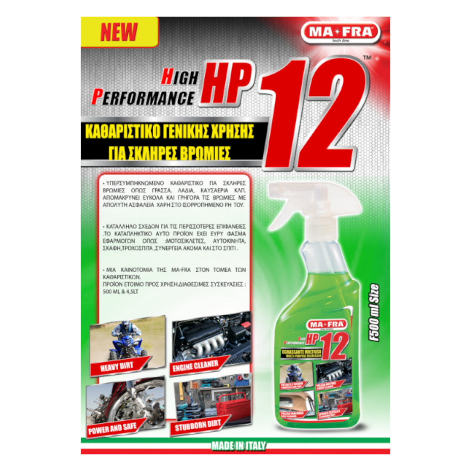 Το HP 12 είναι ισχυρό καθαριστικό για σκληρές βρωμιές. Υπερσυμπυκνωμένο, ισχυρό πολυκαθαριστικό για κάθε επιφάνεια. Ιδανικό για τον καθαρισμό του κινητήρα, για συνεργεία, μηχανικούς, τον καθαρισμό εργαλείων κλπ. Ασφαλές στη χρήση. Ευχάριστο άρωμα λεμόνι.