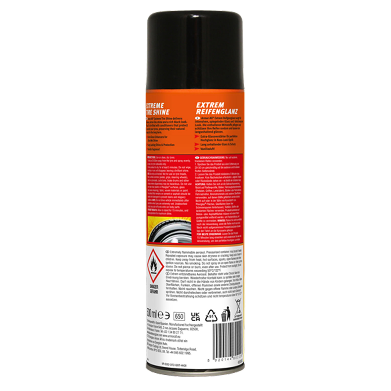 Ο Αφρός Καθαρισμού Ζανών της Armor All είναι ένα προϊόν με βάση τη σιλικόνη που παρέχει προστασία μεγάλης διάρκειας και δίνει στα ελαστικά σας την απόλυτη «υγρή» λάμψη. Μόλις ψεκαστεί, η φόρμουλα Extreme Tire Shine αρχίζει να λειτουργεί επικαλύπτοντας το ελαστικό με μια προστατευτική μεμβράνη που στεγνώνει για να αφήσει μια φρεσκογυαλισμένη λάμψη.